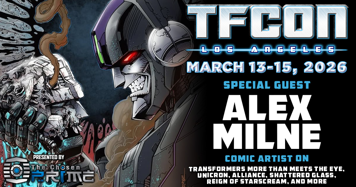 TFcon is very pleased to welcome Alex Milne to TFcon Los Angeles 2025. Transformers fans will recognize his work as the primary artist on IDW’s Transformers: More than Meets the Eye, Transformers vs ROM, the Unicron mini-series as well as the Transformers vs Terminator series. He will be attending all weekend while offering prints and commissions to attendees. Presented by The Chosen Prime.
