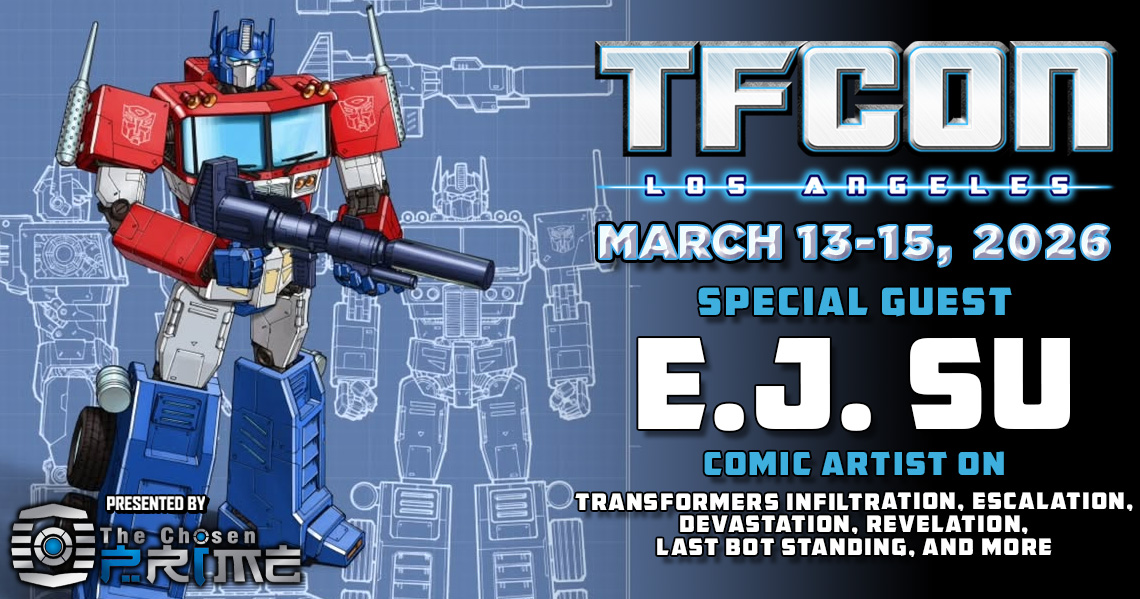 TFcon is happy to welcome Transformers comic book artist E. J. Su to TFcon Los Angeles 2026. He is best known to fans for his work on IDW Publishing’s Infiltration, Escalation, Devastation, and Revelation series. He will be available all weekend for autographs and commissions. Presented by The Chosen Prime